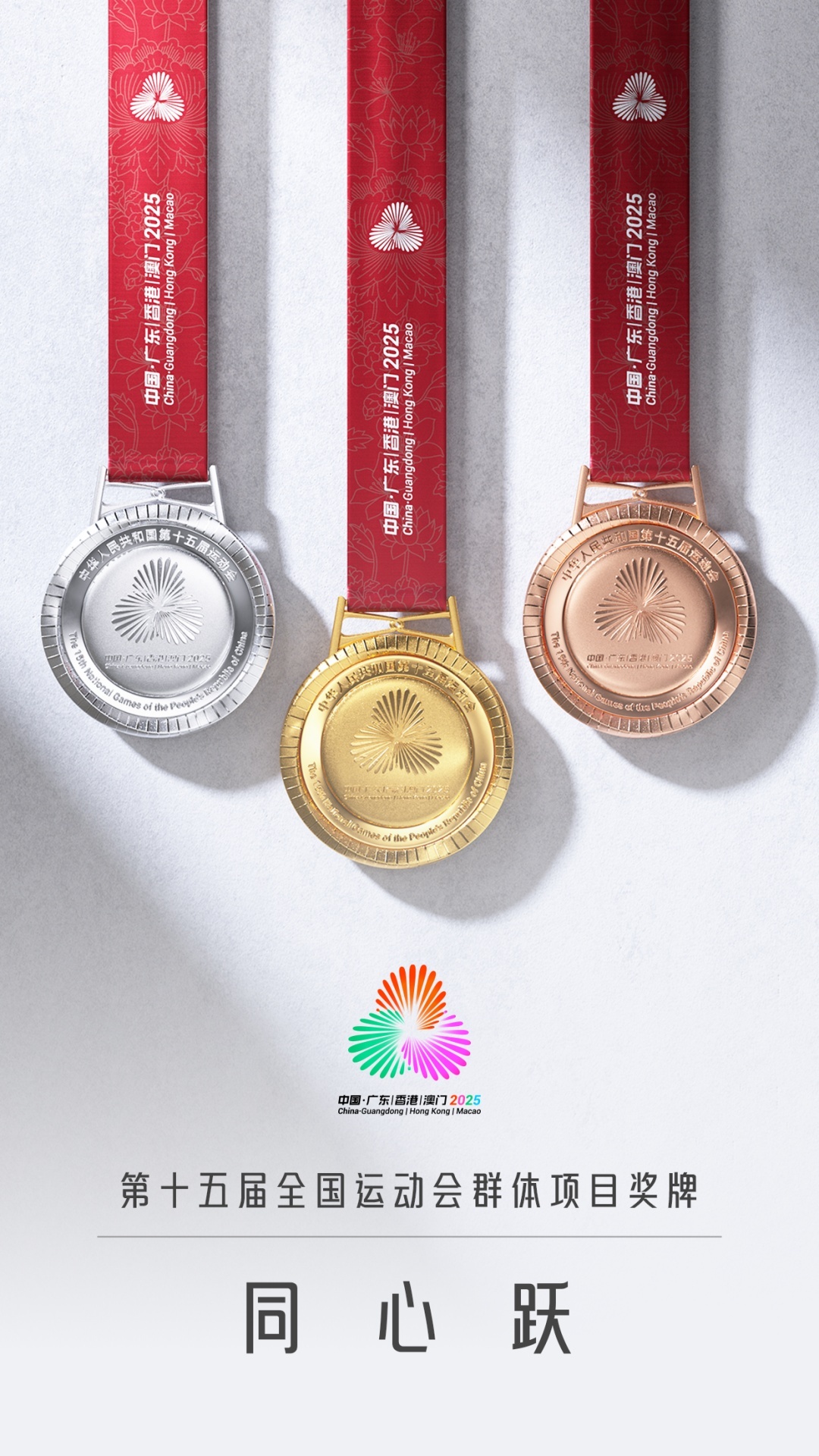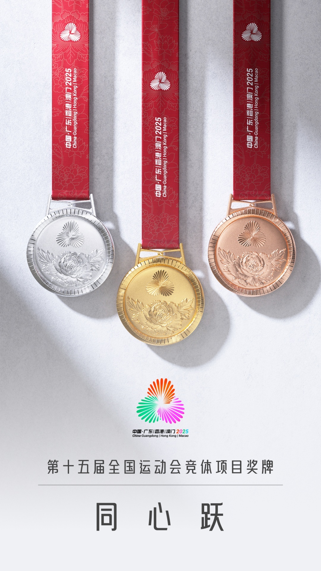 “同心跃”奖牌以匠心设计融合粤港澳大湾区发展脉搏、中华文化底蕴与全运历史传承。竞技体育项目奖牌重354.5克,一面正中上方的会徽由代表粤港澳三地的花瓣交叠扭转形成同心礼花,下方牡丹花托举而上,寓意粤港澳大湾区依托祖国的坚实后盾蓬勃发展,为民族复兴贡献力量;另一面中间的吉祥物中华白海豚手举火炬,灵动活泼,周围浪涛造型的数字“15”巧妙地将全运会届别与体育精神的传承完美结合。